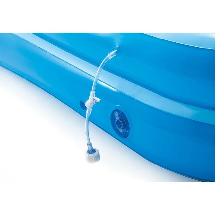 Ingénieuse, cette aire de jeu regroupe deux piscines en une; la pataugeoire pour les jeunes enfants est équipée d’un trou d’évacuation de trop-plein et la grande piscine contient une valve de contrôle pour ajuster le volume de l’eau. La plus grande piscine contient 493 litres. Vos enfants joueront aussi en toute sécurité grâce au tapis de réception du toboggan rembourré.