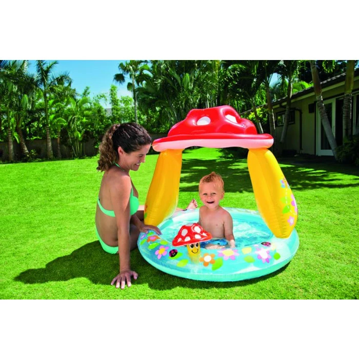 Craquez pour cette piscine champignon avec pare-soleil intégré, votre petit bébé se rafraîchir à l’abri des rayons du soleil et sera émerveillé par les couleurs et les formes de cette aire de jeu gonflable.