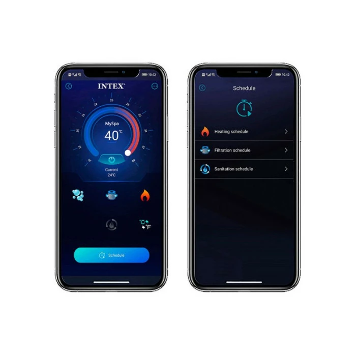 Aujourd’hui, un pas encore plus grand dans la gestion du spa à distance a été fait. Controllez dès maintenant votre Pure Spa Intex avec votre smartphone. Grâce à l’application « Intex Link – Spa Management » vous pourrez programmer le chauffage, la filtration ou encore la stérilisation de votre spa à distance où que vous soyez. Pour celà, voici la marche à suivre :